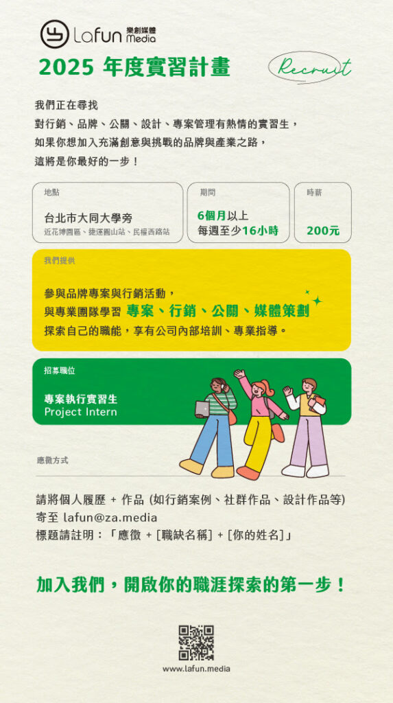 *應徵方式:請學生將個人履歷及相關作品(如行銷案例、社群經營、設計作品)寄至 lafun@za.media 信件標題註明:「應徵 + 專案執行實習生 + 姓名」