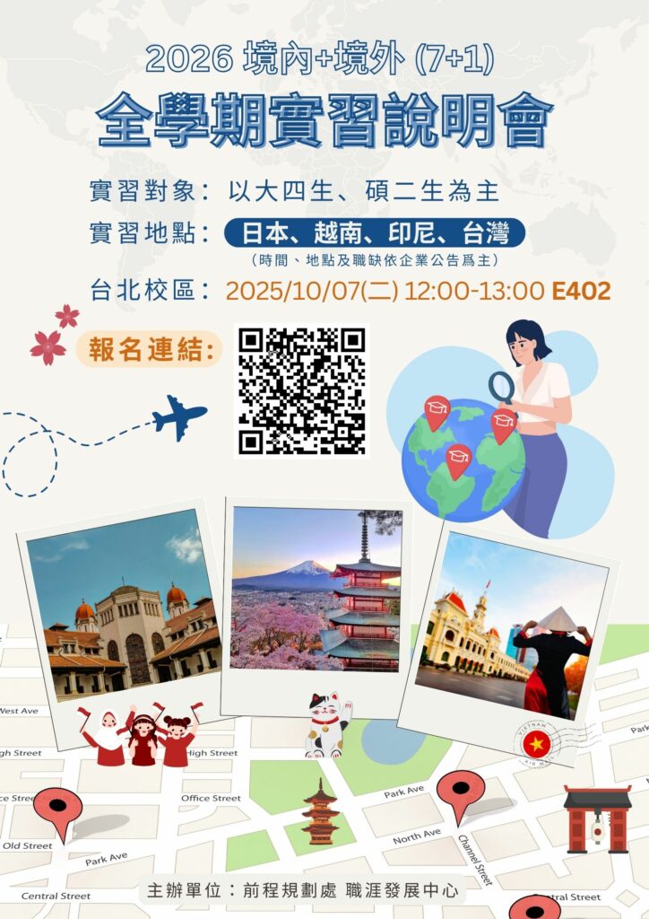 快來參加【2026年境內、境外7+1全學期實習計畫說明會】,掌握申請流程與實習機會!
