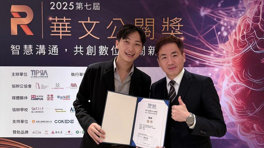 Student CAI, BING-XIU received an Honorable Mention for his proposal “LianThai (in love with Thailand) – learning a different Thailand.” in the 7th Chinese PR Awards (Student PR Strategy Proposal Category) hosted by the Taiwan and Taipei International Public Relations Association (TIPRA). The proposal was based on Tsai’s Instagram account “LianThai,” which he has managed since 2023, focusing on Thai tourism and study abroad information. It effectively incorporated post-pandemic tourism trends and policy insights, with future prospects for collaboration with Thai tourism organizations.